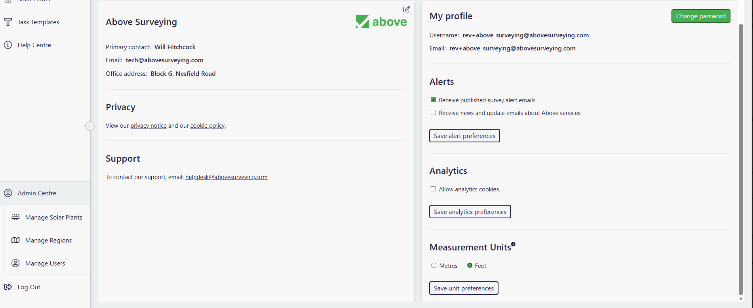 solar plants, regions, and users directly within the Admin Centre, without needing to contact Above Surveying. You can also view your organisation’s details, manage alert preferences, and update your password.