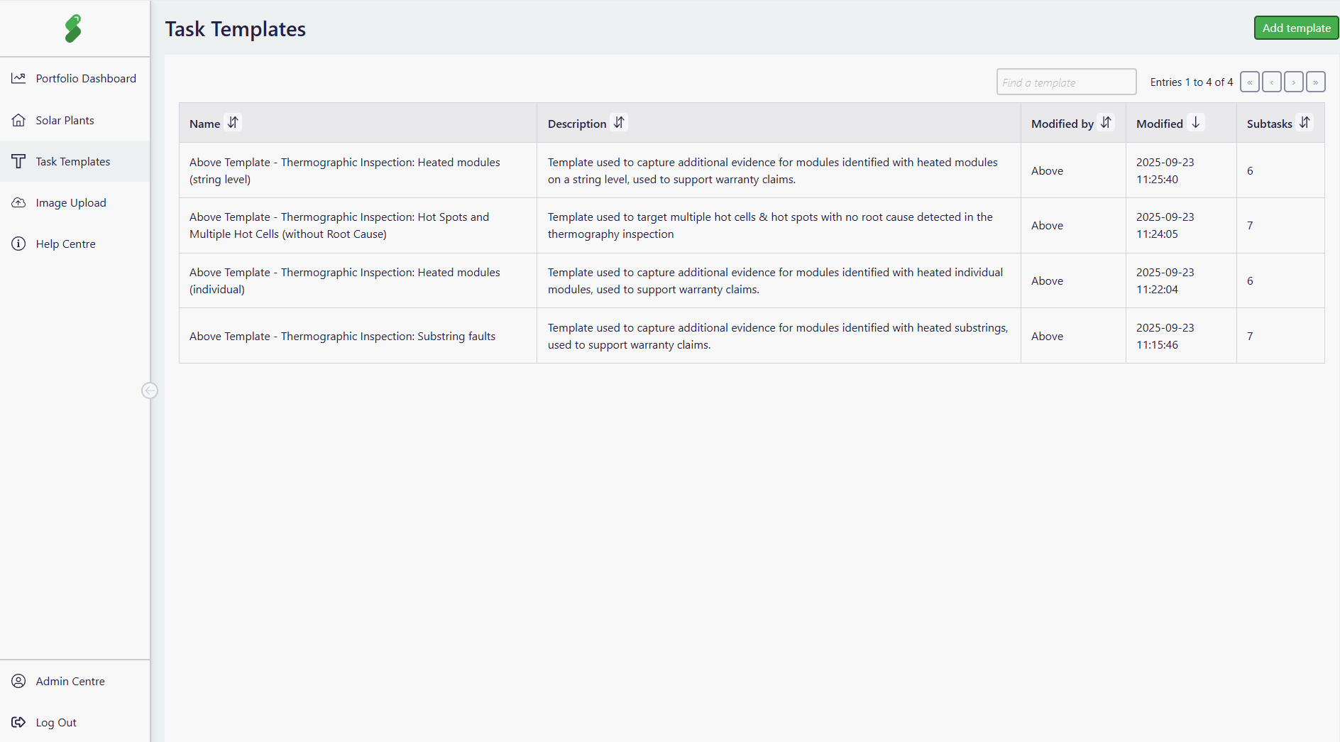 We've added in 4 templates to help with follow-up work required from Thermal reports. These will appear with a title starting "Above Template - ". You won't be able to edit/delete these, but you will be able to duplicate them to add further subtasks.