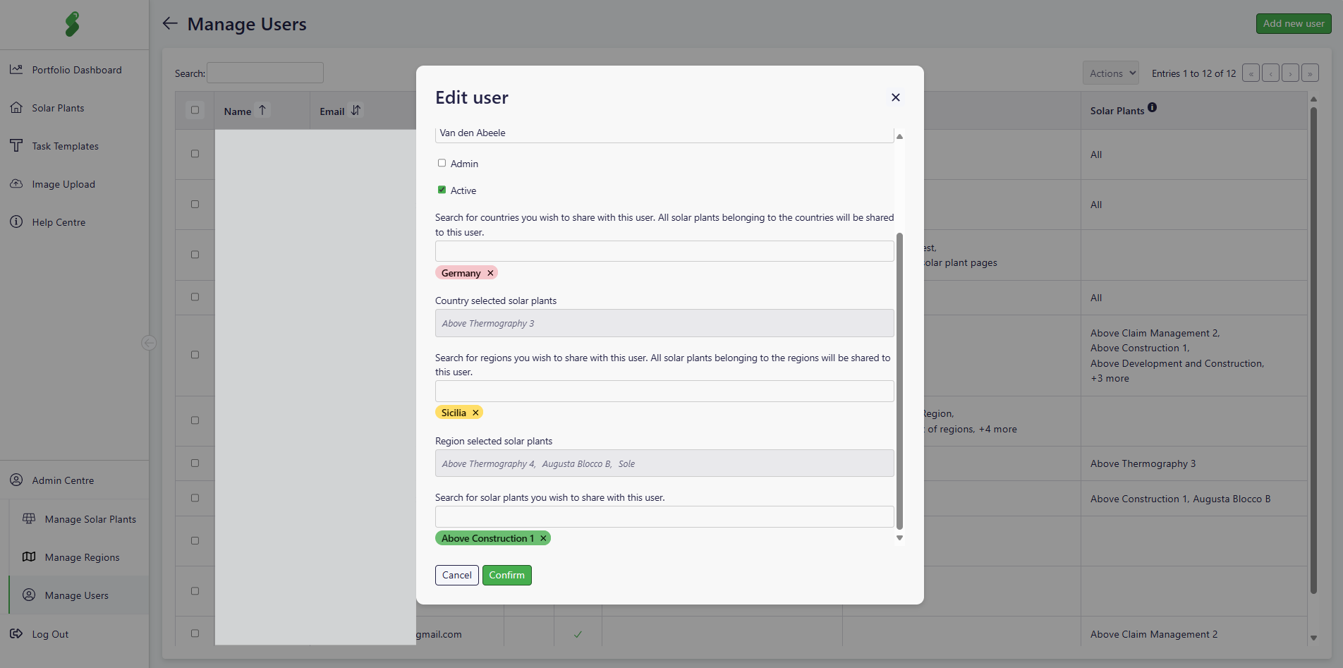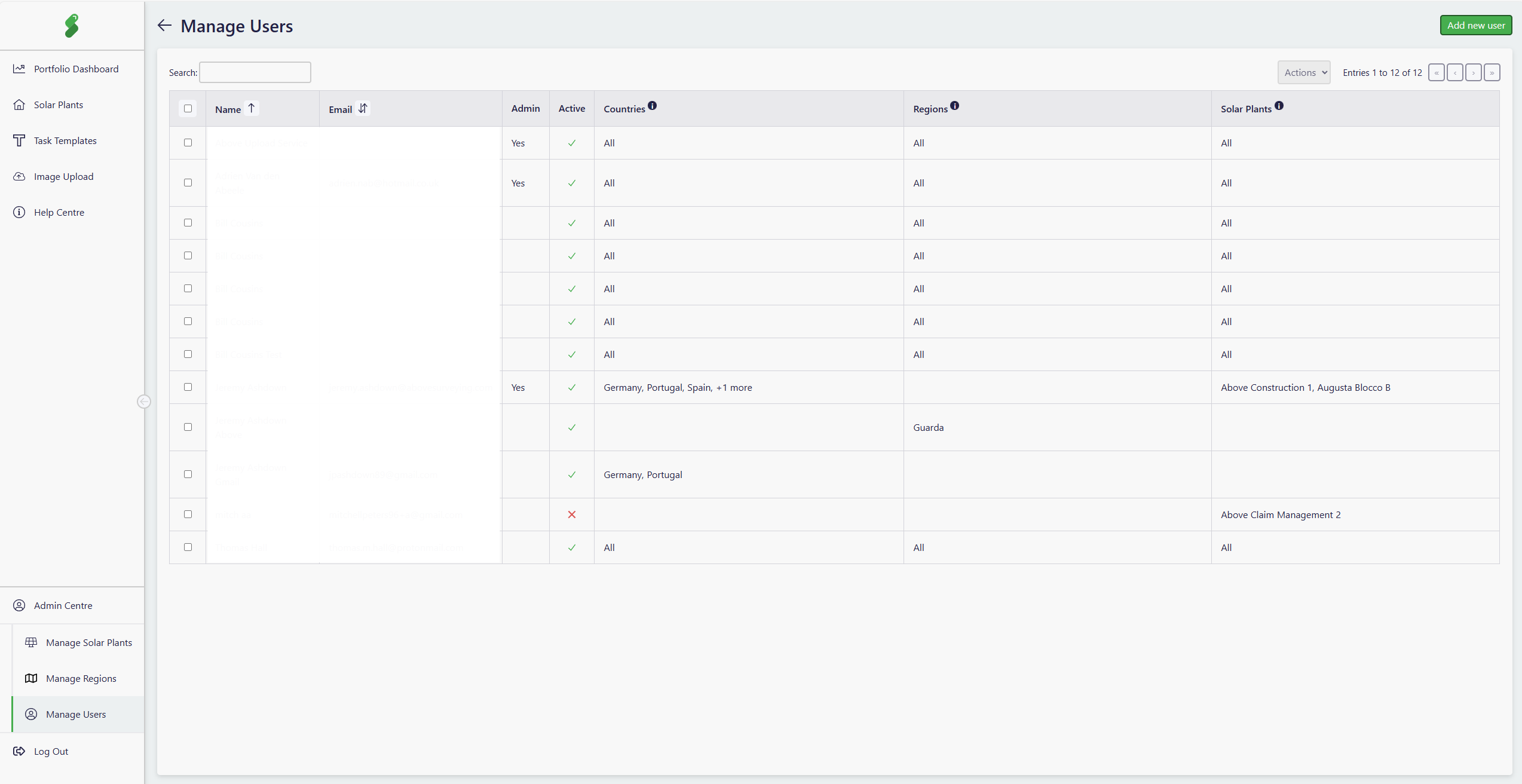 You can now apply access to a user based on the country or region of a solar plant. You can also apply individual access to a solar plant. By default, all the existing access' will apply until this is changed for a user e.g. Until you've given access to a country, region or individual solar plant.