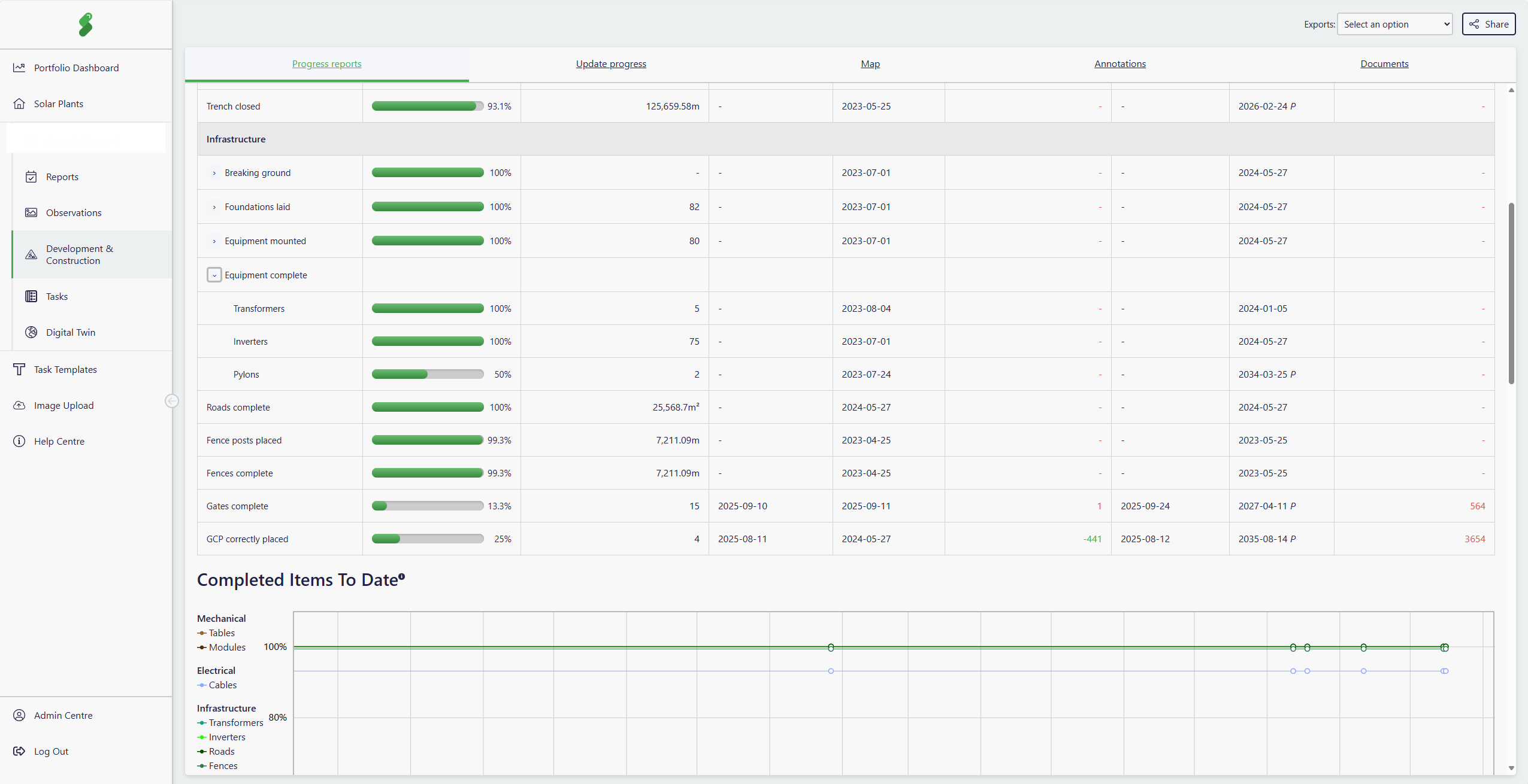 Progress Reports: Updates will appear in all charts, with distinction between Above data (from drone scans) and user data (added via Update Progress)