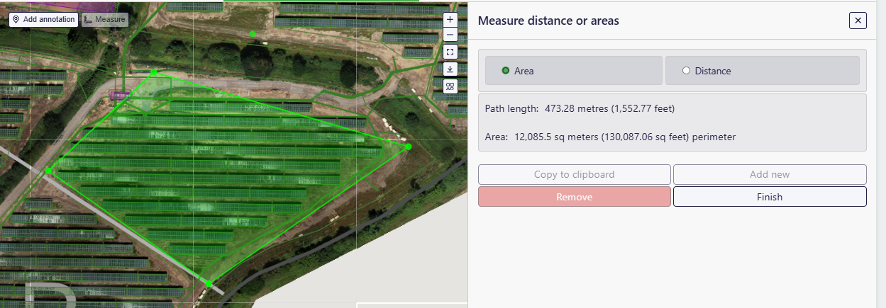 This tool enables the user to measure distance or areas in the map. Users can use it to check the pitch distance between trackers, distance to the fence or even to calculate the transformer station area among others.