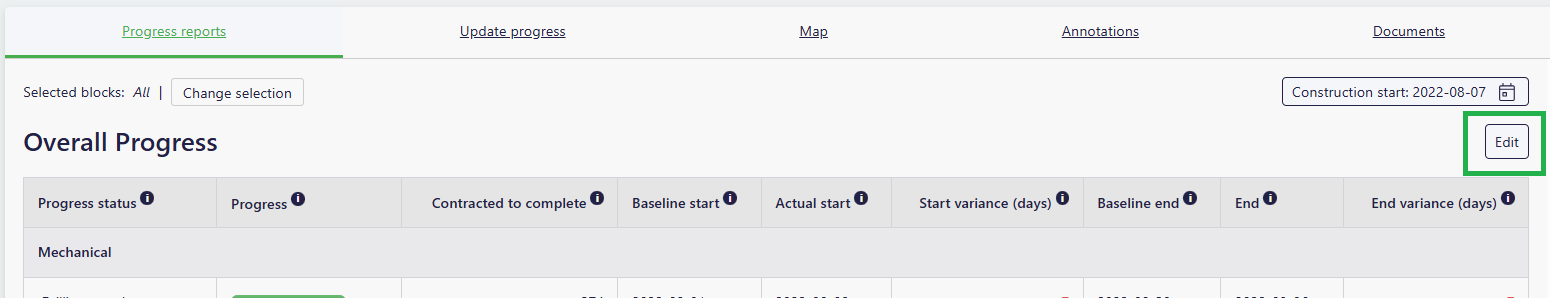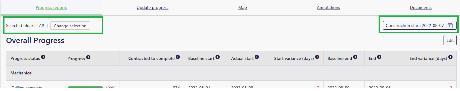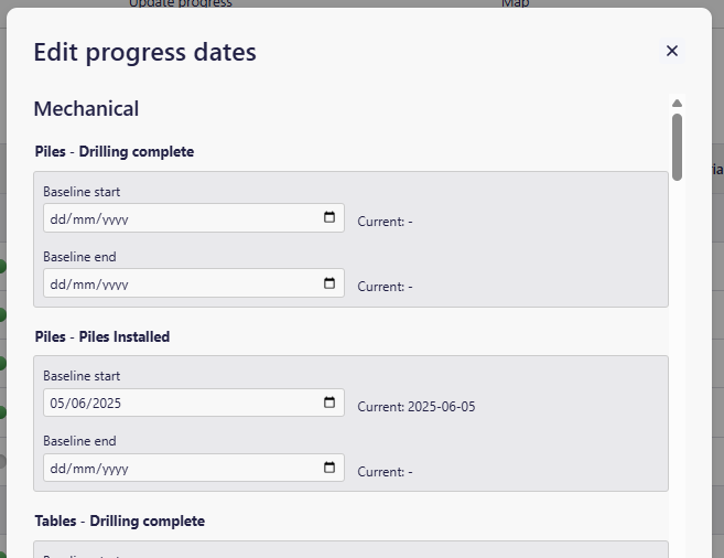The project should show a construction start date. A start date is required to update the component progress, otherwise the start date will be based on the first drone event date. This date should only be changed at the start of the project, or if there is no start date.