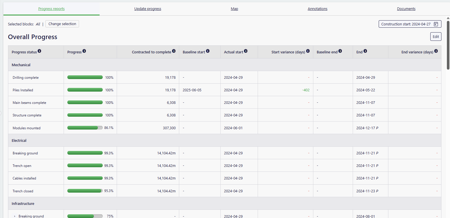 This chart shows the Overall Progress throughout the key stages of the construction phase. Each section is broken apart by Mechanical, Electrical and Infrastructure. If a stage applies to different components, the section can be expanded to a lower tier, showing precise detail of each stage.