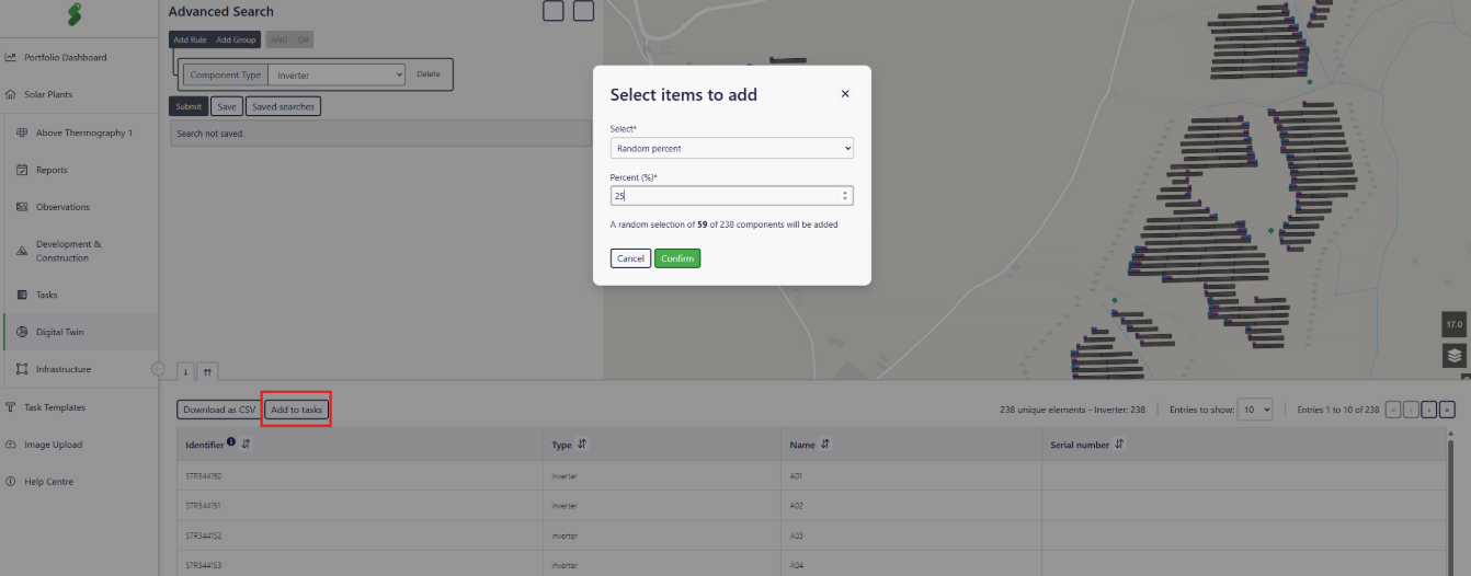 You can select any component type from the Digital Twin, click "Add to tasks" button, which will allow you to choose a random percent or random number to add for spot checking on site. Please see the steps in this video: