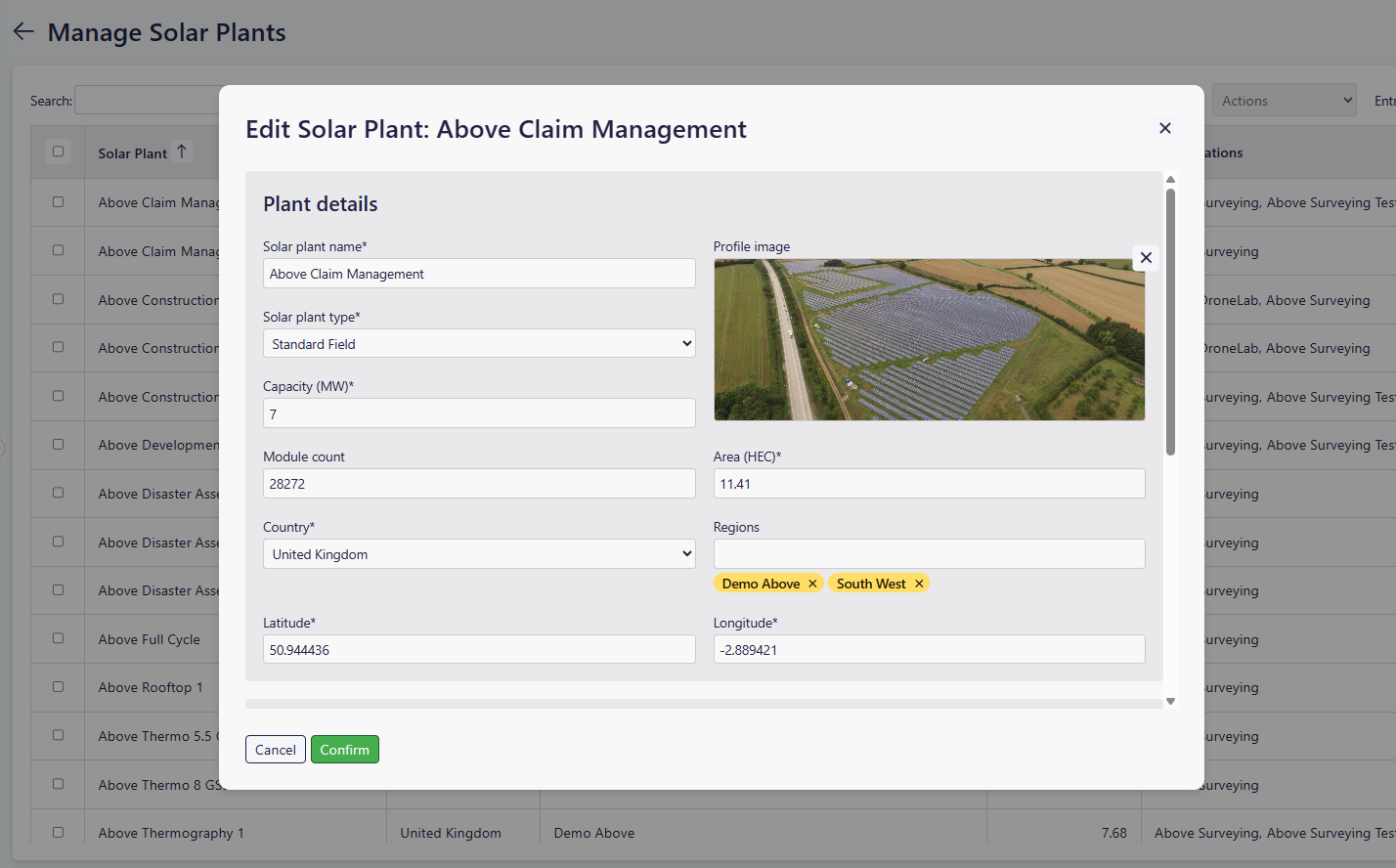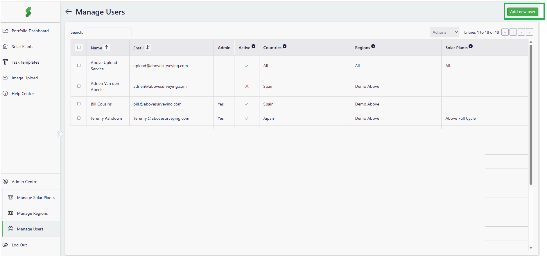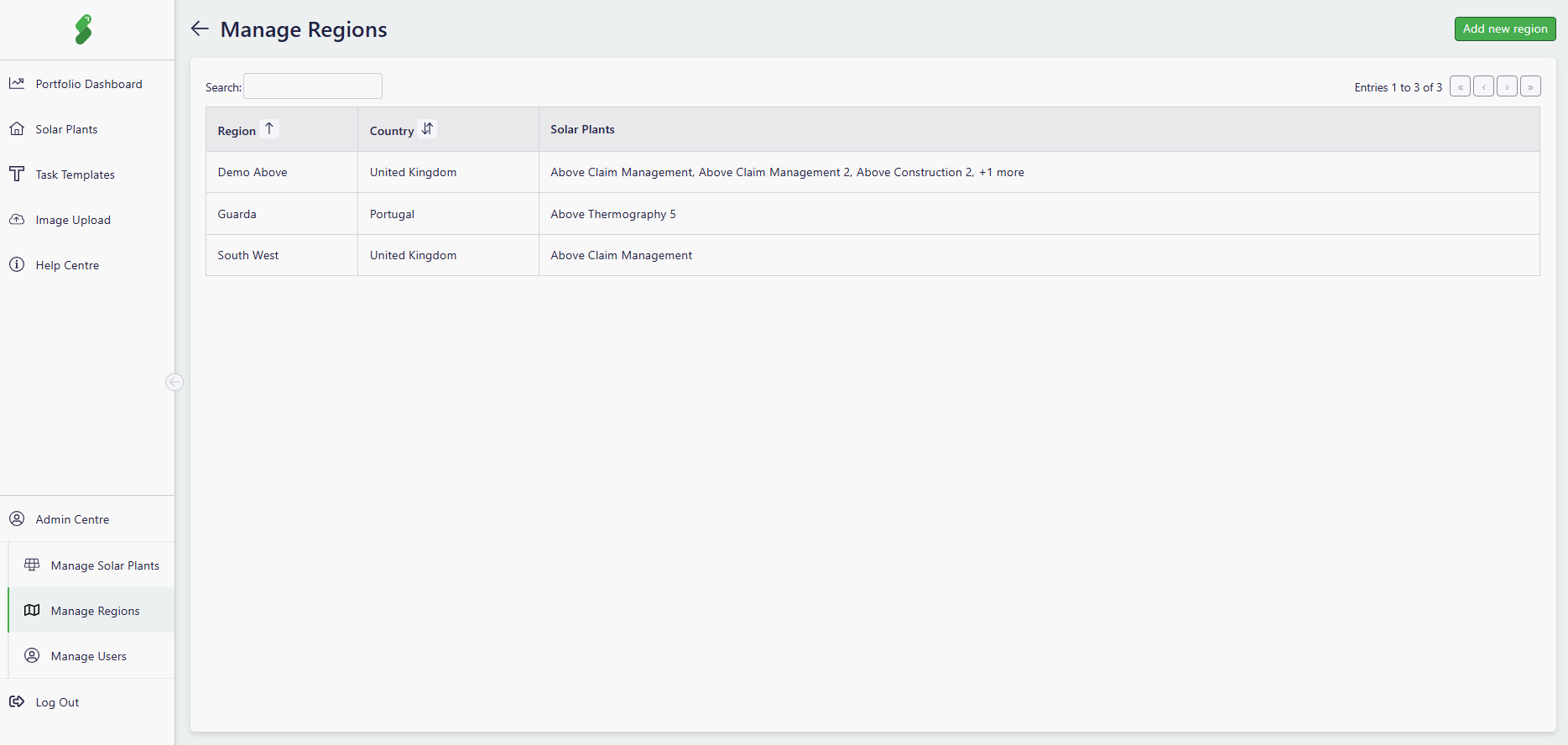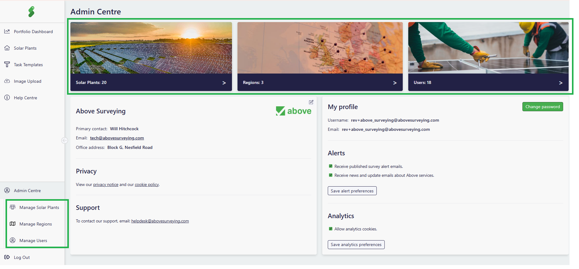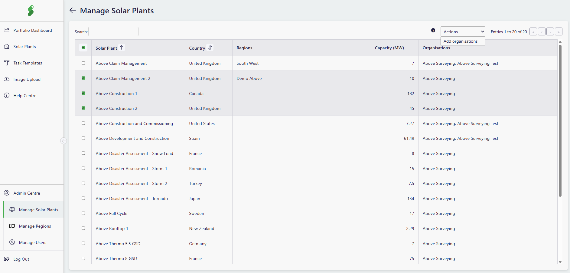 Overview What can I do in the Admin Centre as an Admin? As a user with an Admin role, you can manage your organisation’s solar plants, regions, and users directly within the Admin Centre, without needing to contact Above Surveying. You can also view ...