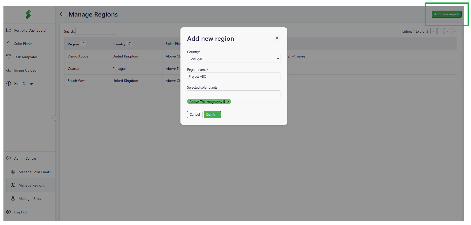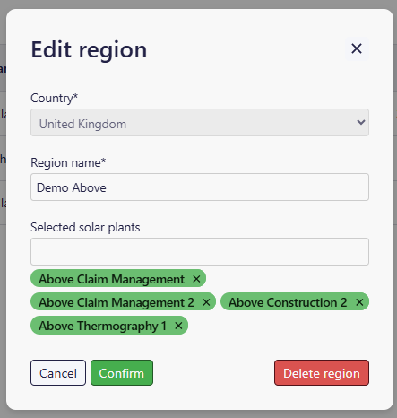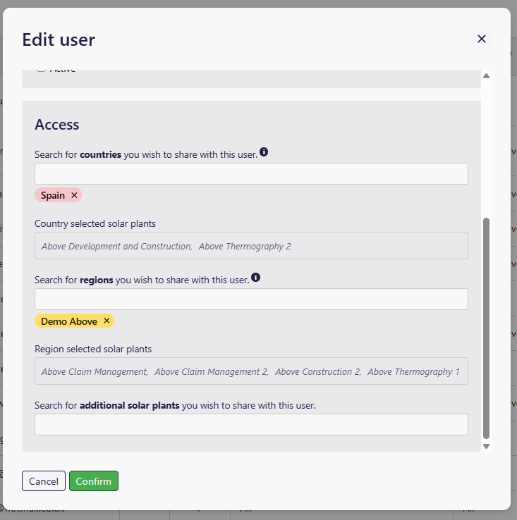 - If you still want to restrict a users view, please ensure that a new region is created or they are assigned to a country or specific solar farms, otherwise, user will have full access to the entire portfolio