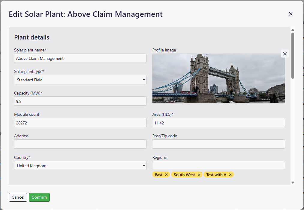 - The solar plant image can be changed by clicking on the X in the upper right corner of the image. If no image is added, it will revert to a default image.