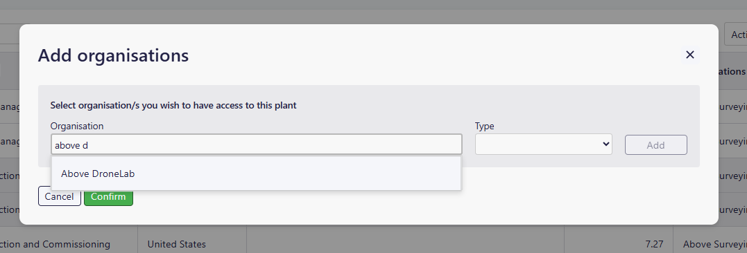 In order to "share" a solar plant with another organisation, an existing organisation can be "added".