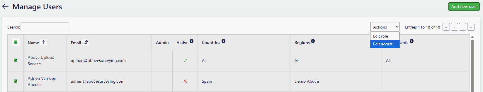 - Click Actions dropdown → Edit role (Admin or non-Admin) OR Edit access (to change country, region, solar plant access)
