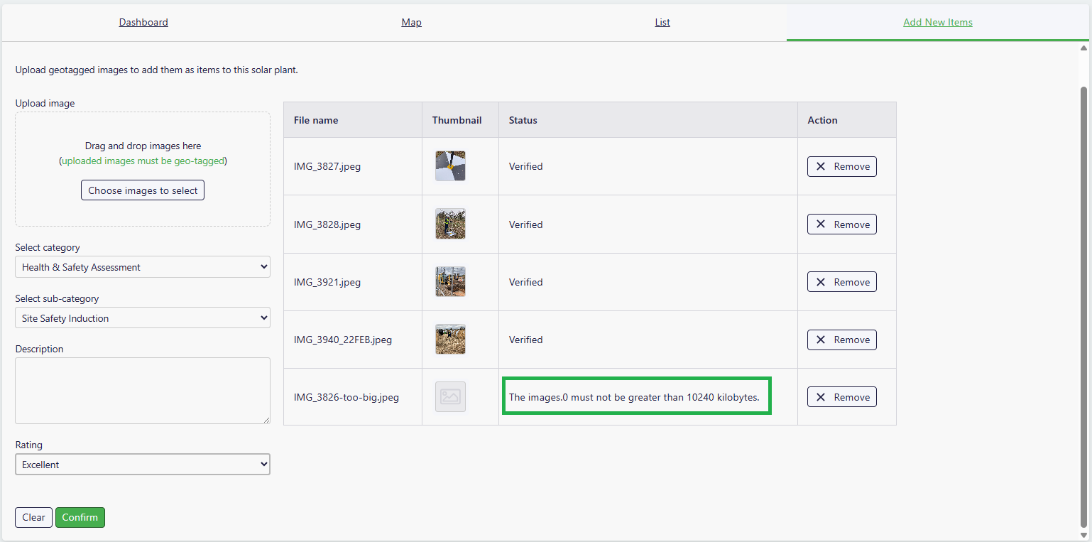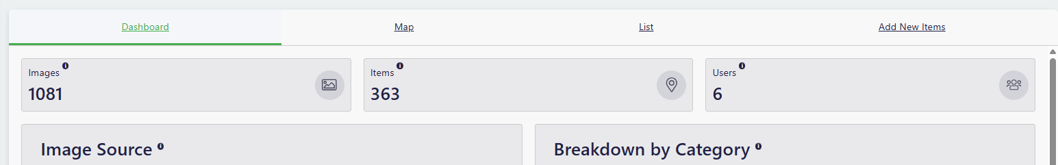 The Add New Items tab allows you to upload images directly into Observations from the portal. Each uploaded image becomes a new item that can be categorised and geo-tagged, ensuring it appears correctly in both the Map and List views.