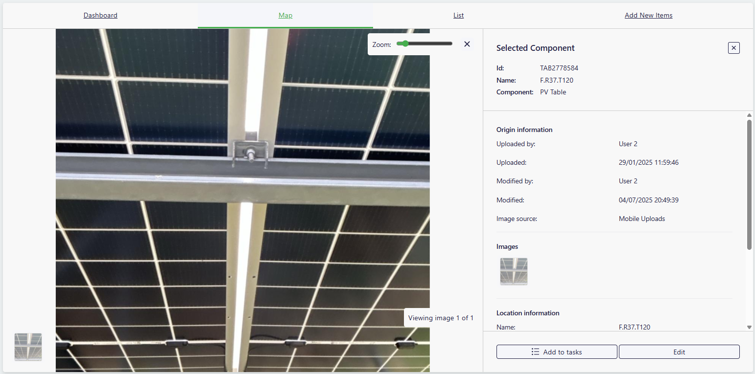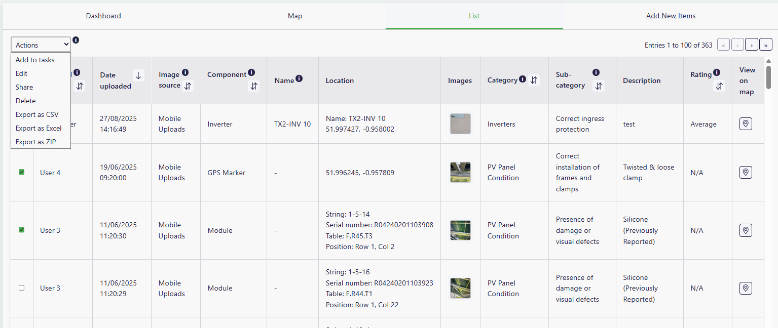 Every image in Observations belongs to an item. Items may be linked to a component on the plant map, or shown with a GPS marker if no component link exists. This ensures that all uploaded images can be organised, located, and reused in reports and task lists.