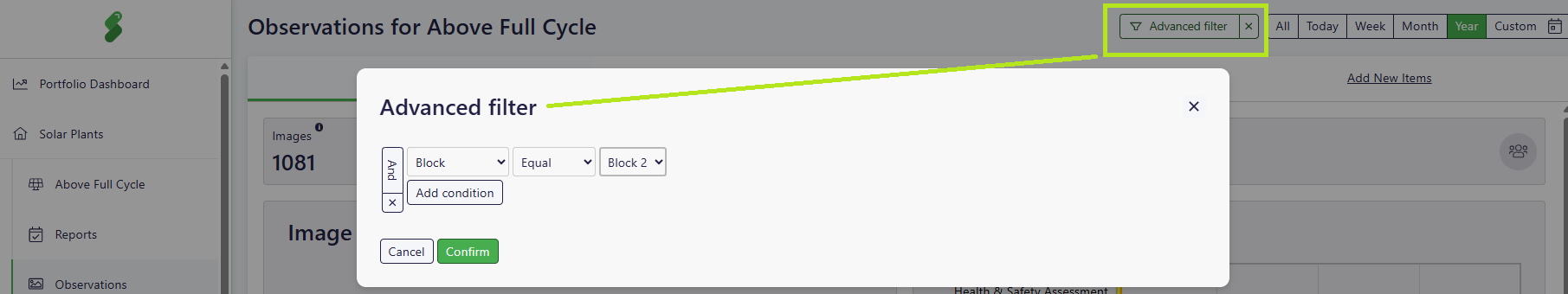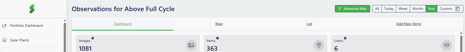 Observations is available at the solar plant level in the portal and is divided into four tabs: Dashboard, Map, List, Add New Items