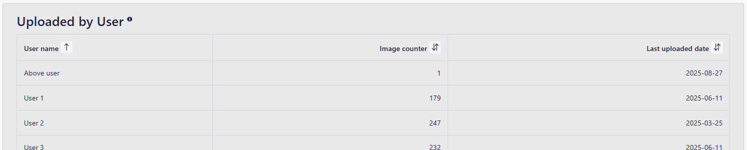 Uploaded by user - This table shows who uploaded the images, how many and when. This is sorted by last updated date.
