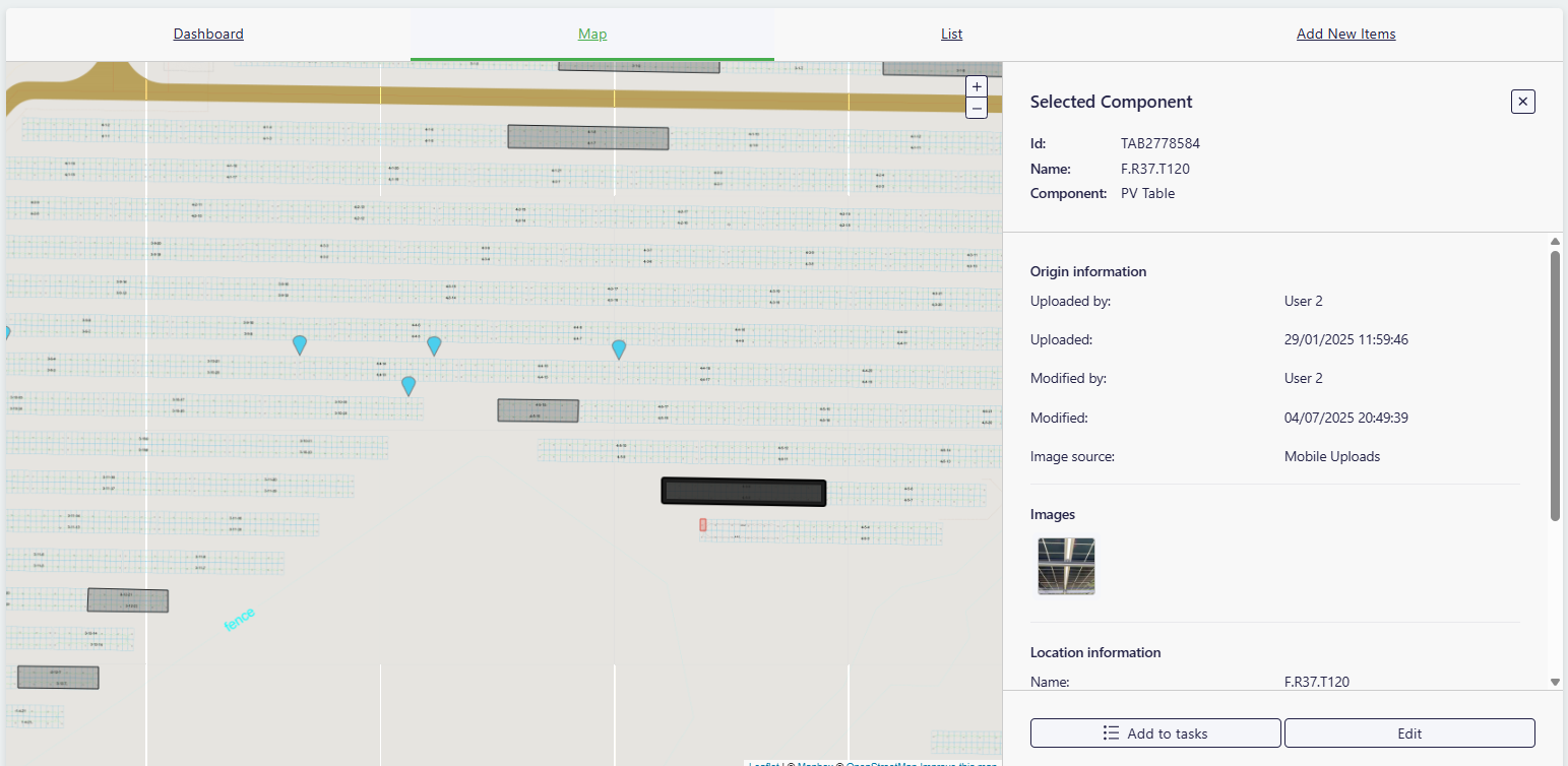 The Map view displays images geographically. Items appear as markers or component highlights on the solar plant map. Selecting a marker pin or component opens a right drawer with key details, including: