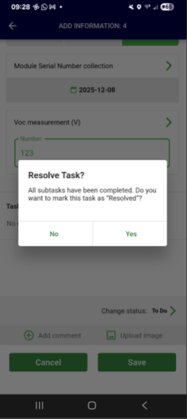 If ALL the subtasks are actioned (even those that have a "Failed" status), there will be a modal asking if the user would like to "Resolve Task". Clicking Yes will mark that tasks status as Resolved. Clicking No will retain the existing status.