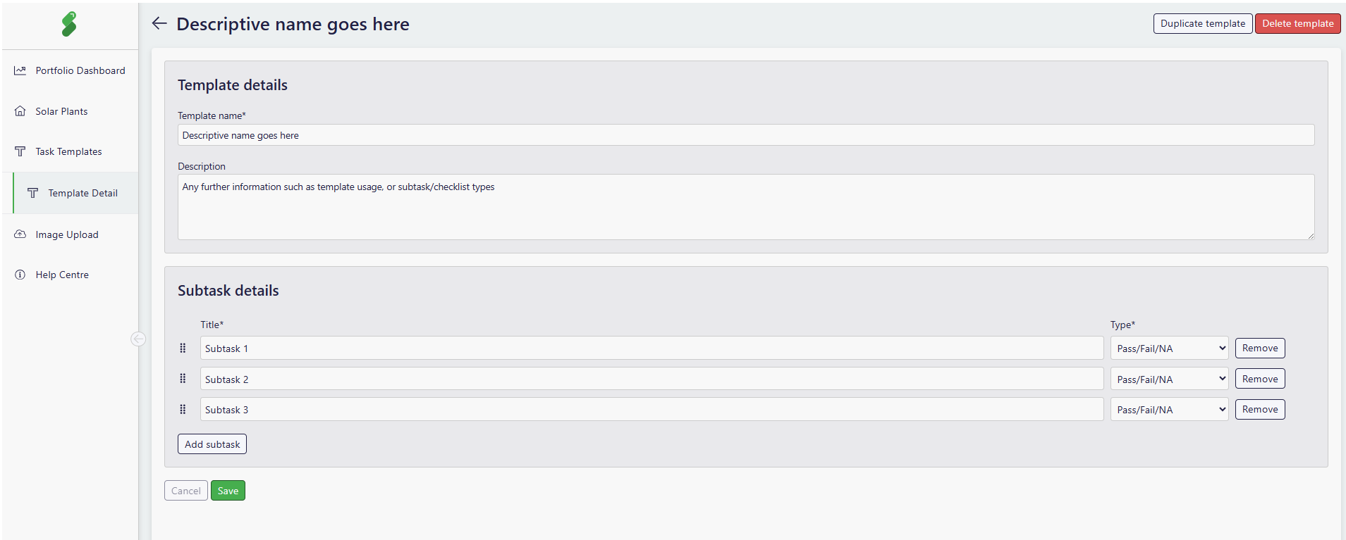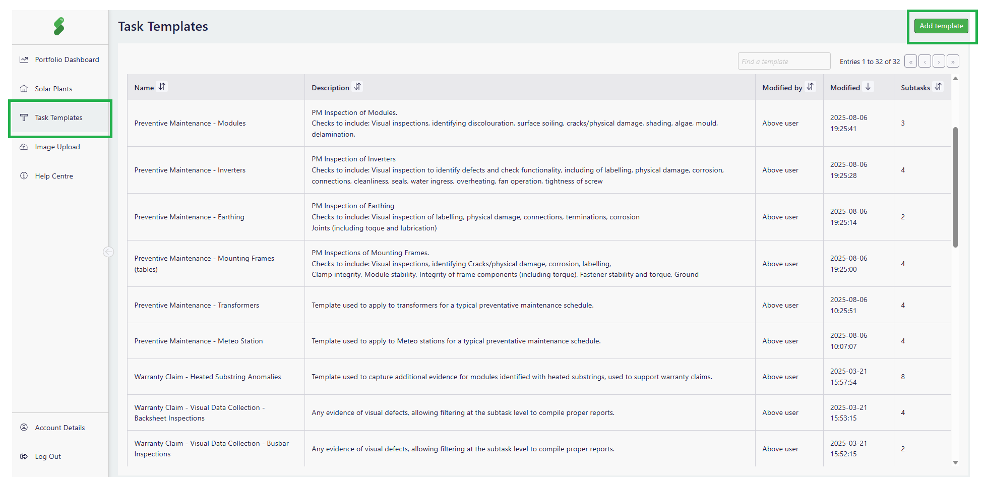 Templates are managed on a portfolio level, so they can be applied to tasks in any solar farm the user has access to. The templates can be accessed from the left menu. A new template can be added by clicking on the "Add Template" button in the upper right corner.