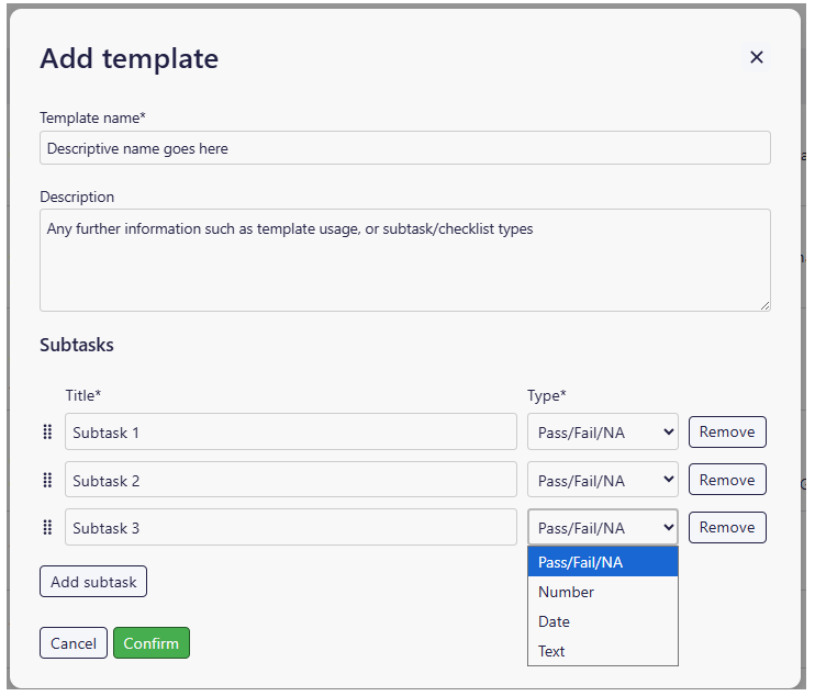 A template is a pre-defined list of subtasks that can be added when a user is adding tasks from: