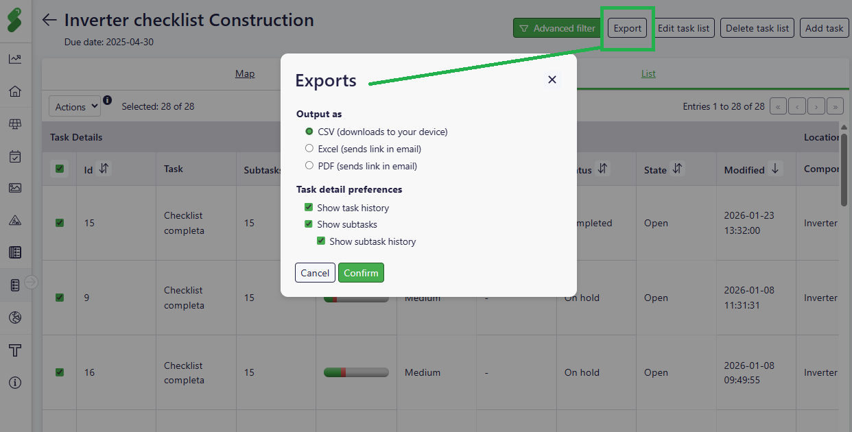 Clicking on the Export button at the top of the Task List page displays a modal that gives export options for the selected Task List.