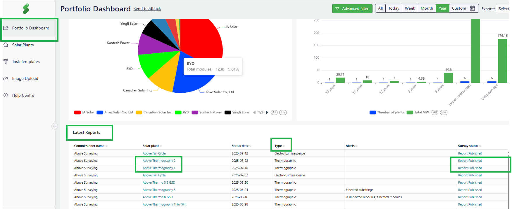- To access the solar plant landing page, click on the link under Solar plant column. To jump to the specific report, click on the link "Report published" under the Survey status column