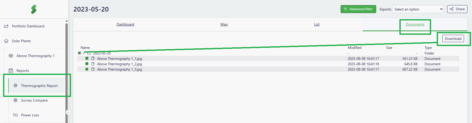 Typically, when a Thermographic inspection is done, the drone pilot will take images of the entire site from overhead. This can be downloaded from the Documents tab and used for reports or marketing.