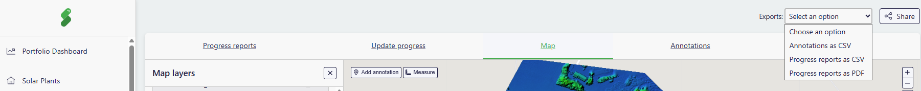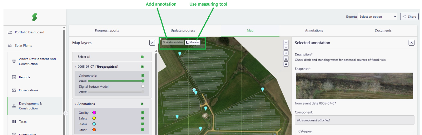 The orthomosaic and DSM are displayed within the SolarGain portal as interactive layers, allowing users to view and analyse them directly within the platform to aid visualization and project management.