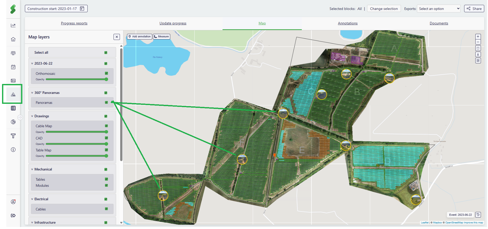 To access the panorama, click on the desired solar plant and then the Development and Construction page. Click on the map tab on top. If the latest date has corresponding panoramas, small circles will overlay the map.