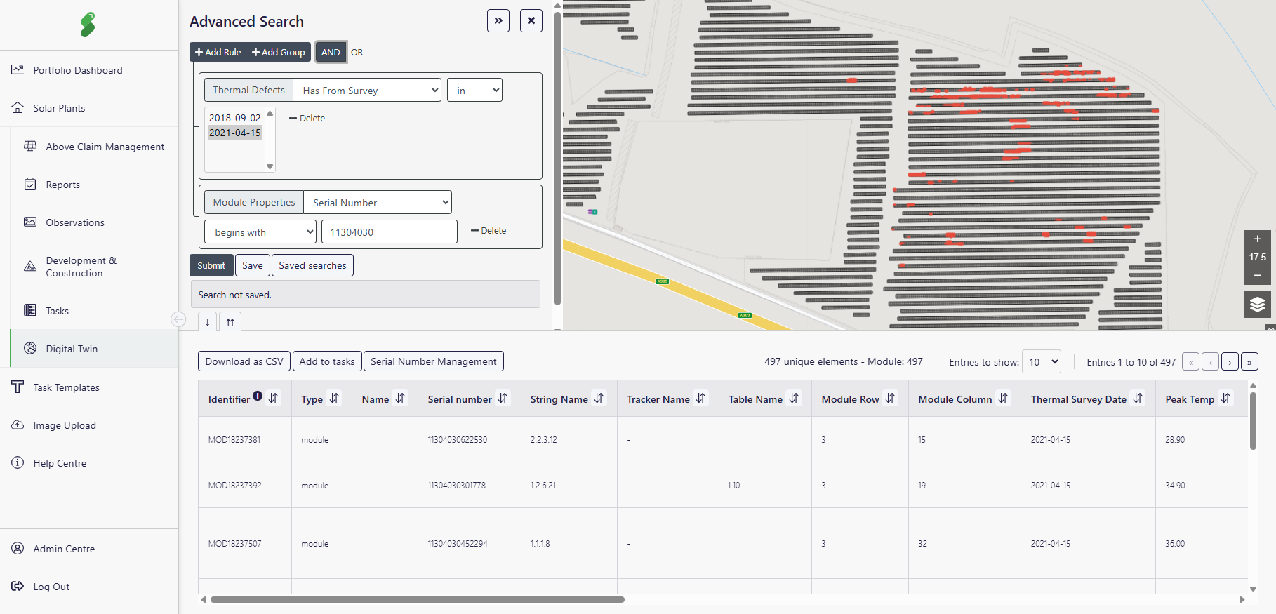 Overview & Display / Advanced Search What is shown in the Digital Twin view? The Digital Twin provides a geospatial map-style representation of the site, showing all main electrical components: transformers, inverters, combiner boxes, strings, ...